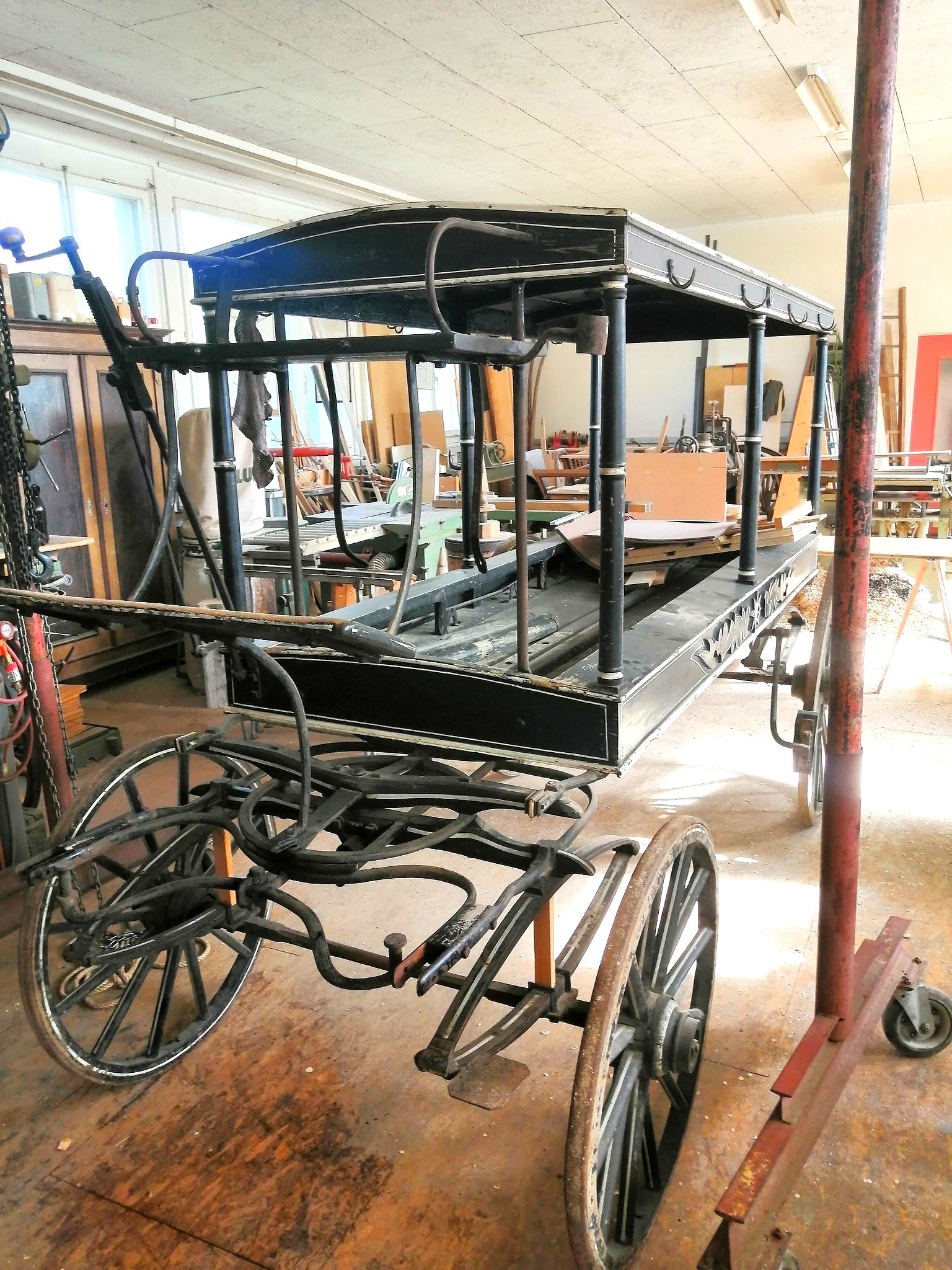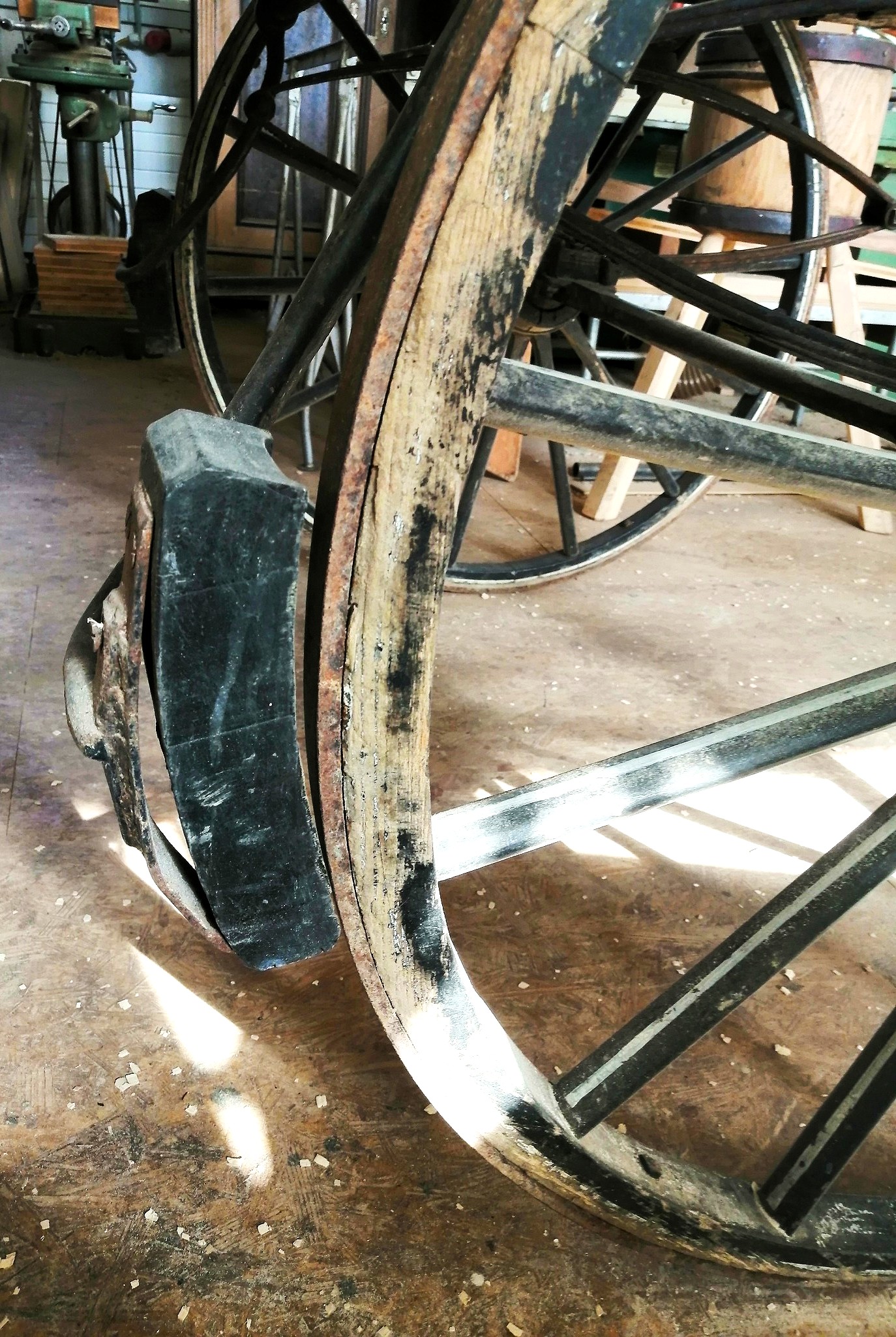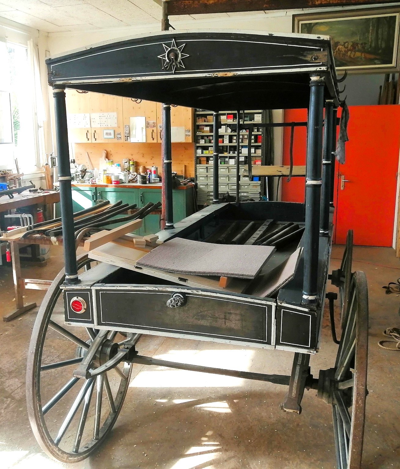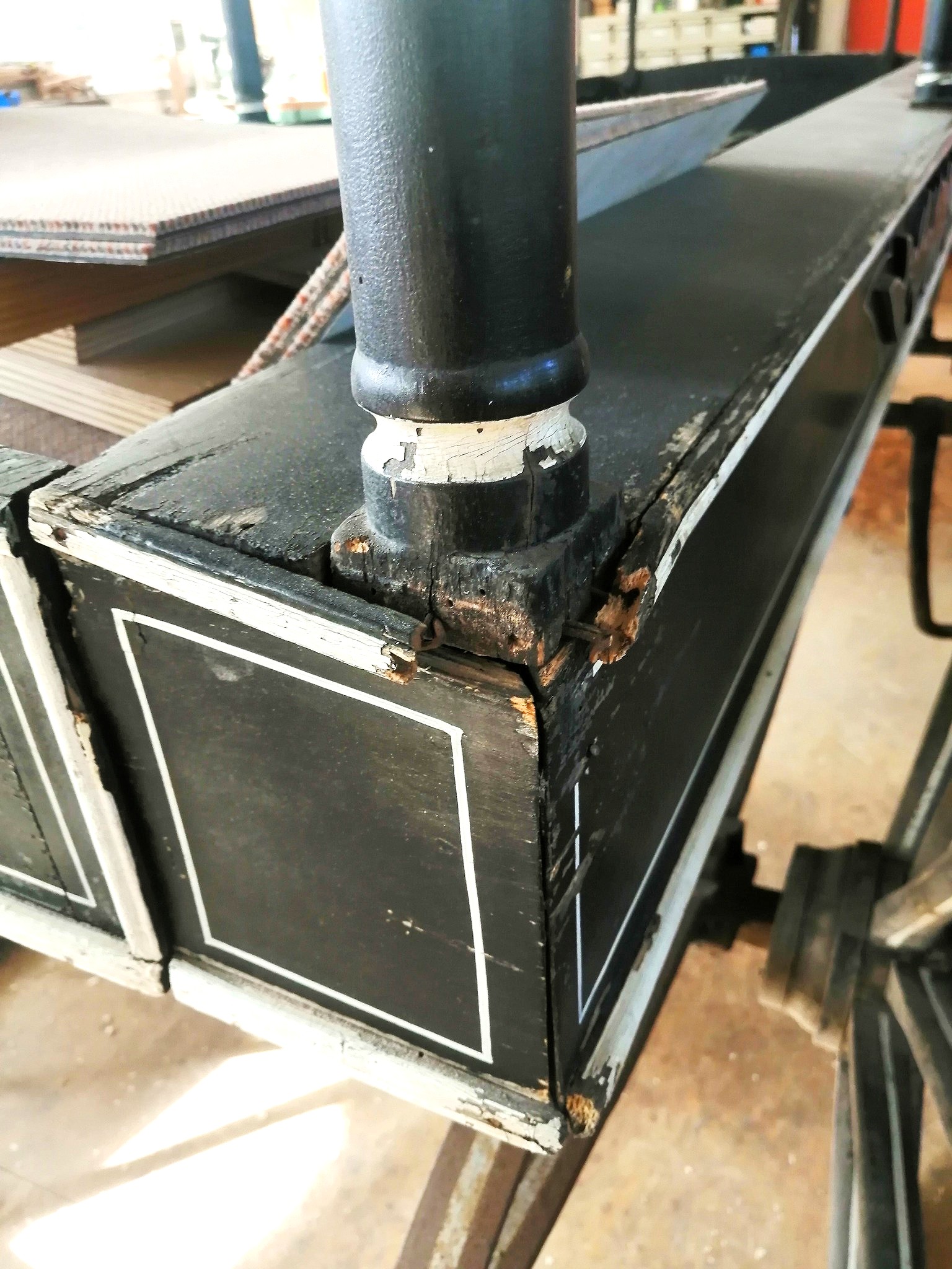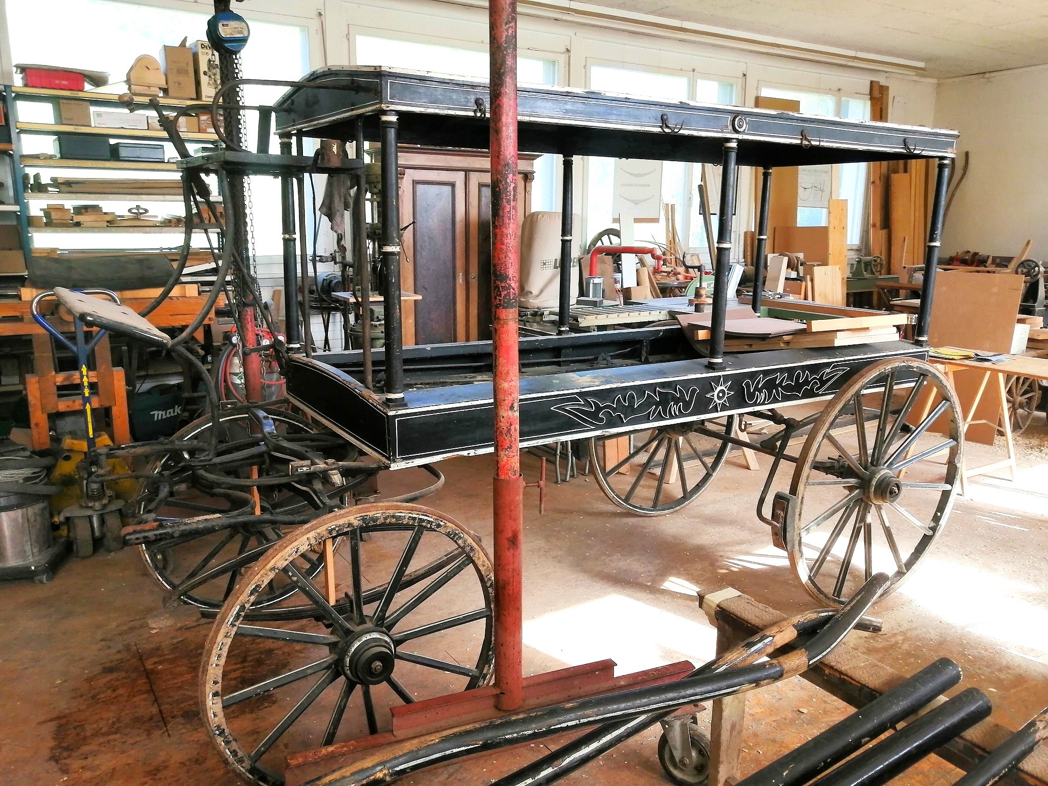 Nú eru sjálfboðaliðar safnsins okkar að endurgera vagninn af kostgæfni með því að fjarlægja ryð og gamla málningu, fylla í og gera við sprungur í viðarhlutum og undirbúa að mála vagninn aftur í litum sem passa við upprunalegu litina.
