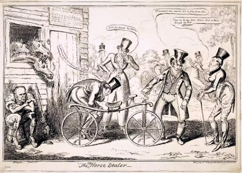 Hlaupahjól og knapi almennt talinn vera barón Karl von Drais, um 1818. Mynd fengin að láni frá: www.cyclinguk.org