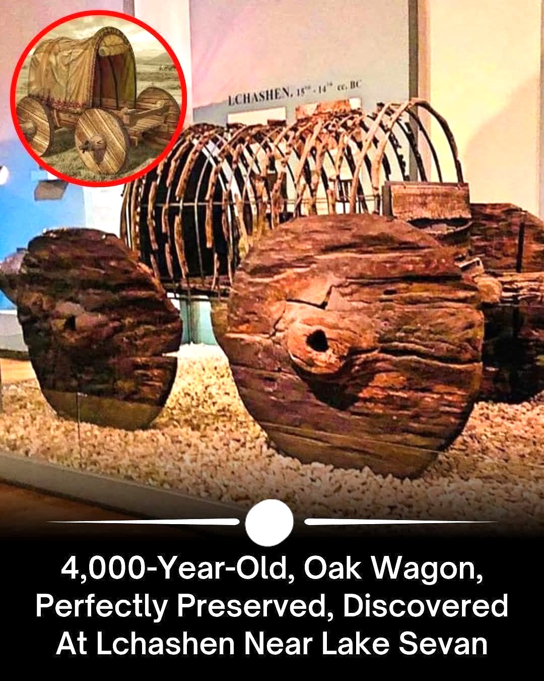 Þessi frábærlega varðveitti 4.000 ára gamli vagn, aðeins úr eik, fannst neðanjarðar í þorpinu Lchashen nálægt Sevan-vatni í Armeníu. Eikarvagninn er meðal elstu vagna í heiminum.