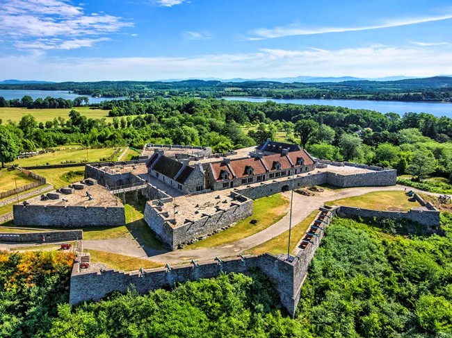 Hið ógurlega Ticonderoga-virki gnæfir yfir Champlain-vatn í norðurhluta New York-fylkis, norðlægur varnargarður gegn breska Kanada í bandarísku byltingunni Með leyfi frá Carl Heilman II, Fort Ticonderoga