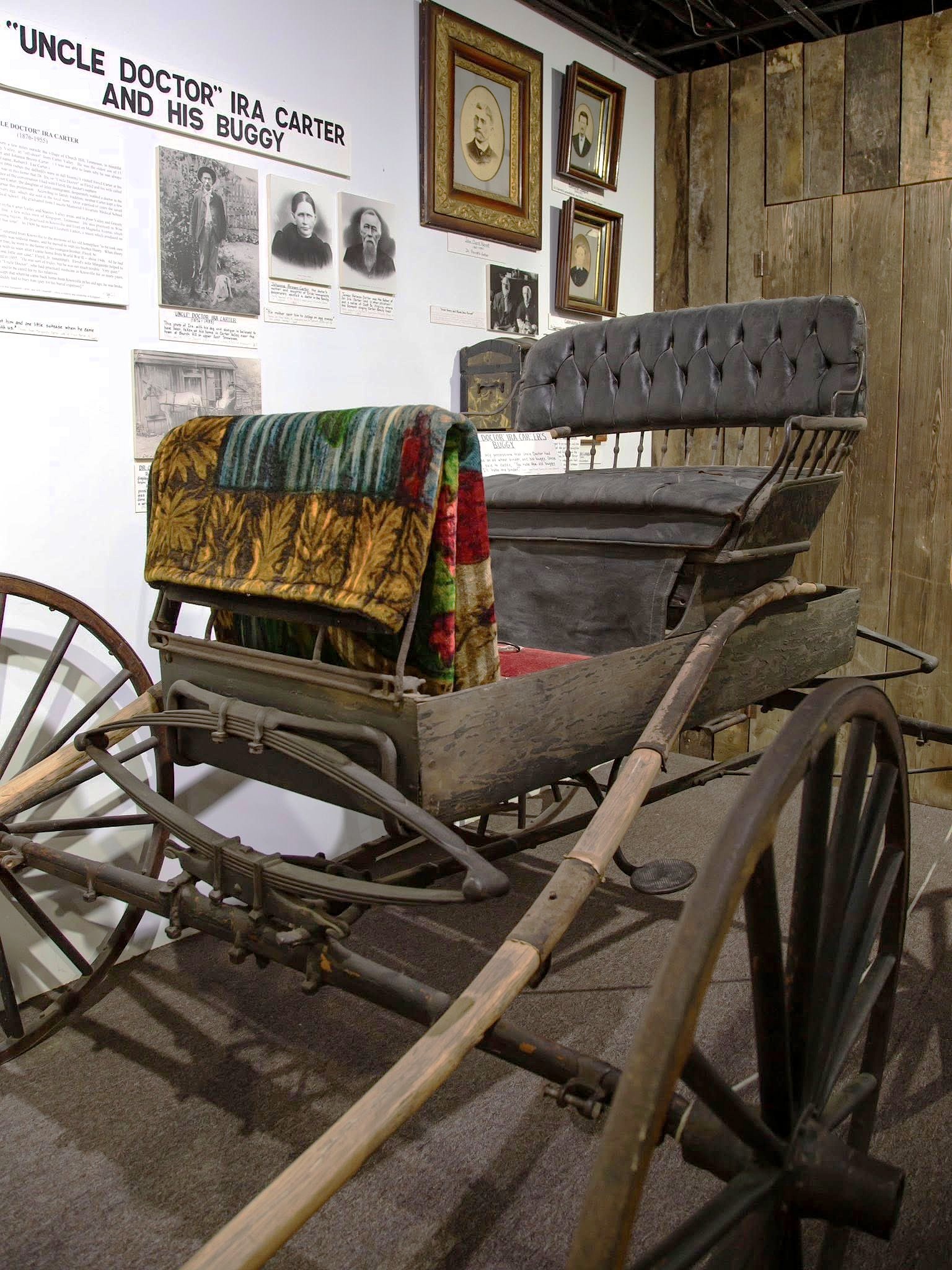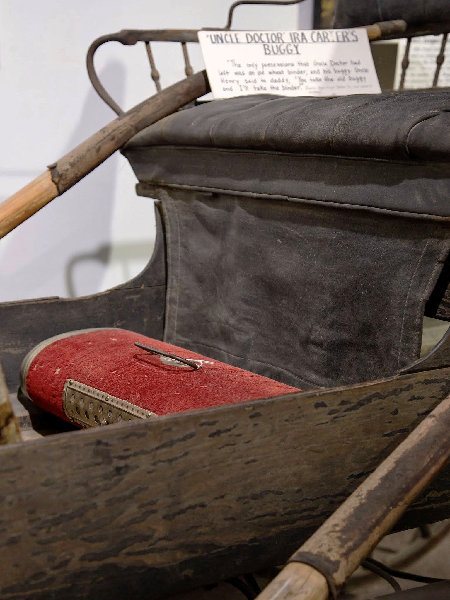 Ábreiðan og fóthitarinn prýða vagn Dr. Robert Lee (Ira) Carter (1876-1955) frá Carter Valley nálægt Church Hill í Tennessee.